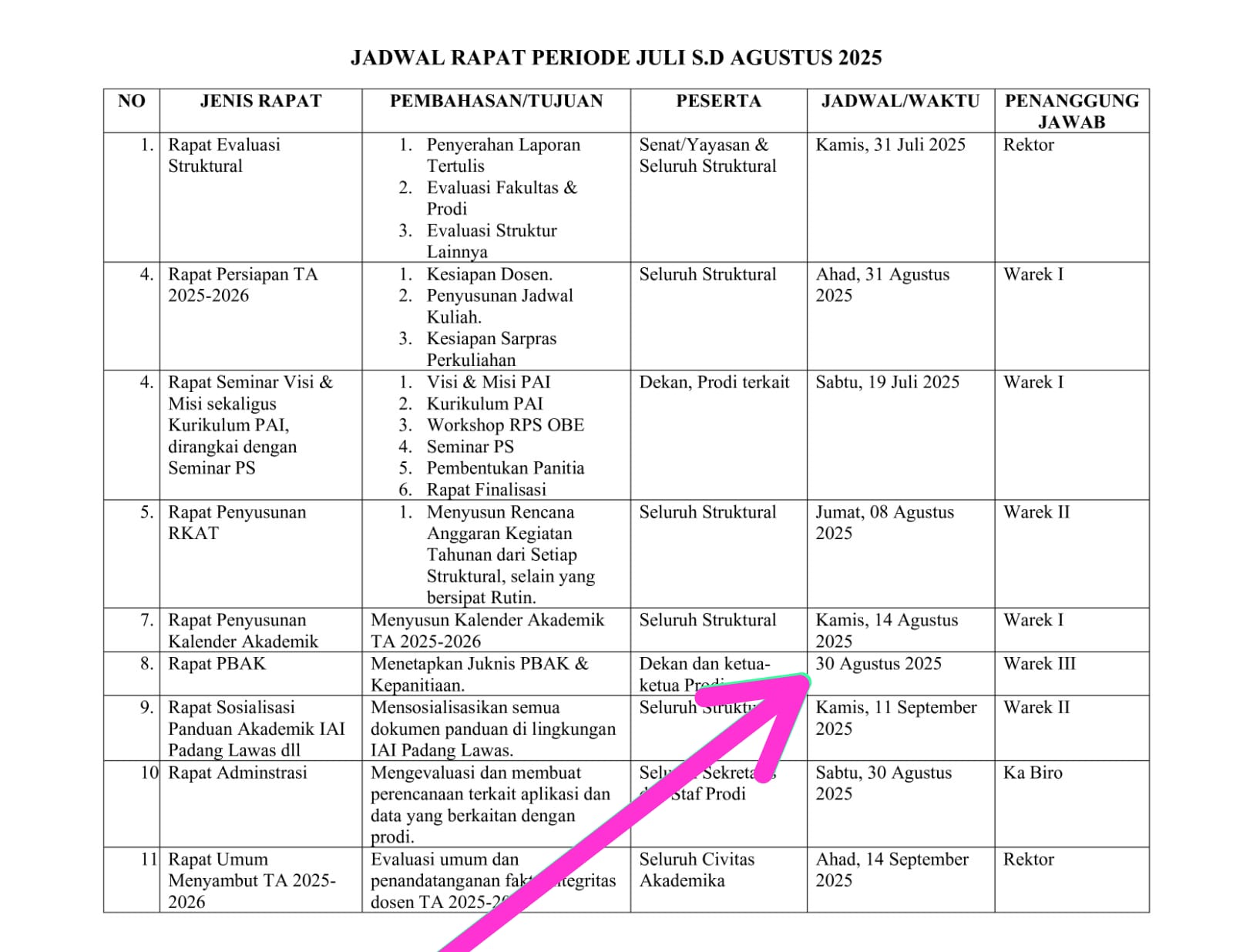 Rektor dan sejumlah pejabat struktural Institut Agama Islam Padang Lawas melaksanakan sejumlah rapat persiapan untuk menyambut Tahun Akademik 2025-2026. Bulan Juli hingga awal September 2025 adalah bulan rapat bagi semua sivitas akademika IAI Padang Lawas, ungkap Rektor. Mulai dari evaluasi kinerja struktural dan dosen, kelengkapan dokumen induk penyelenggaraa program studi baru yaitu PAI yang menyangkut dengan Visi Misi Tujuan dan Strategi, kurikulum dan lainnya. ada juga rapat rapat optimalisasi rekrutmen camaba yang sudah berjalan sebulan sebelumnya, hingga persiapan PBAK mahasiswa baru. Rektor juga menginstruksikan supaya semua dosen melengkapi akun pribadi IAI Padang Lawas-nya terkait dengan Google, Sister dan Sinta yang terperifikai ke pangkalan data dan homebase IAI Padang Lawas.