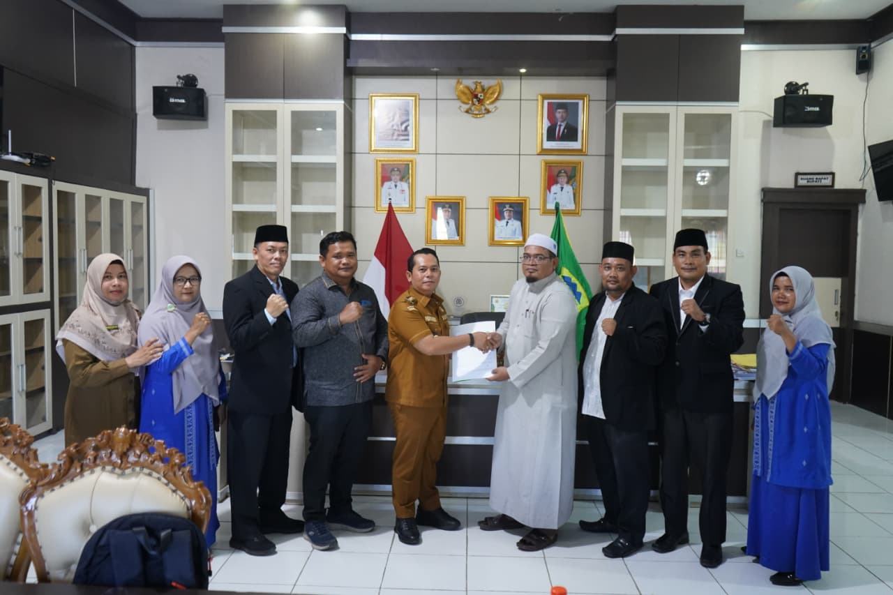 Bupati Padang Lawas Putra Mahkota Alam Hasibuan SE bersama Rektor Institut Agama Islam Padang Lawas H. Ismail Nasution, Lc., M.TH melakukan penanda tanganan kerjasama antara Pemerintah Kabupaten Padang Lawas dan IAI Padang Lawas di ruang Kerja Bupati Padang Lawas. Selasa, (26/08/25)